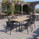 This set is a perfect combination of style and functionality for your outdoor dining area. Create a contemporary and inviting space where you can gather with friends and family, enjoying meals and creating lasting memories. This set is designed to elevate your outdoor experience with its sleek design, stackable chairs, and resilient construction.