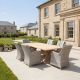 The Hartman Regis Teak Dining Table with 6 Hamilton Chairs includes a 240cm rectangular teak table with metal X legs and six Hamilton half rounded weave chairs. The chairs feature rounded high backs and come with seat and back cushions. The aluminum frames of the chairs are rust-resistant, and the design has a luxurious finish.
